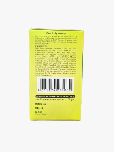 Tulsi Patra (Ocimum Sanctum)-12.24%, Tej Patra (Cinnamomum inners)-12.24%, Rakat Chandan (Pterocarpus santalinus)-18.36%, Talis Patra (Abies webbiana)-9.18%, Agyghas (Cymbopogana martini) 9.18% , Pudina (Mentha Spicata )-9.18%, Mulethi (Glycyrrhiza Glabra)-6.12%, Saunf (Foeniculum Vulgure )-3.06%, Brahmi (Bacopa monieri )-3.06%, Banafhsa(viola odorata)-3.06%, Mustak (Cyperus rotundus)-3.06%, Netra Bala (Valeriana indica )-3.06%, Khas (Vetiveria zizanioidis ) -1.22%,Brihat Ela (Elerttaria cardamum)-1.22%, Dalchini (Cinamum zelyanicum)-1.22%, Pipli (Piper longum)-1.22%, lavang (Syzygium aromaticus ) 0.61%, Badia Khatai (Illicium verum )-0.61%,Excepients—q.s