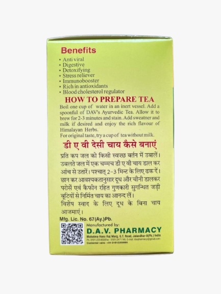 Boil one cup of water inn an inert vessel. Add a spoonful of DAV’s Ayurvedic Tea Allow it to brew for 2-3 minutes and stain . Add add milk if Desired and enjoy the rich flavor of Himalayan Herbs . For original taste , try cup of tea without milk